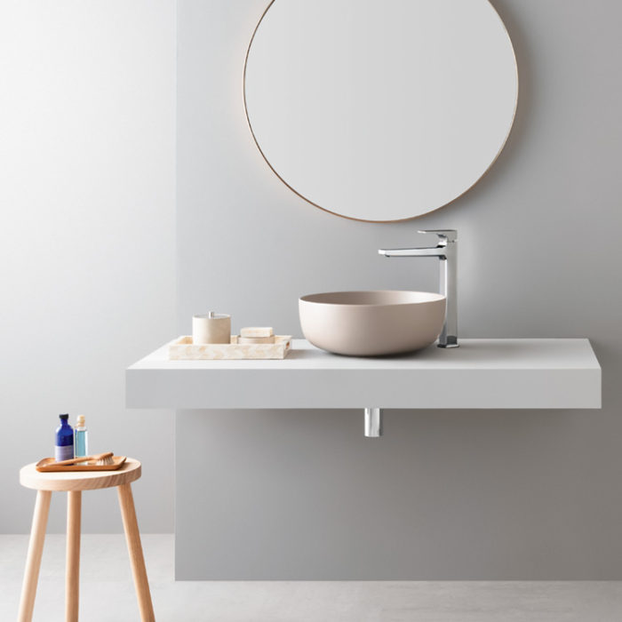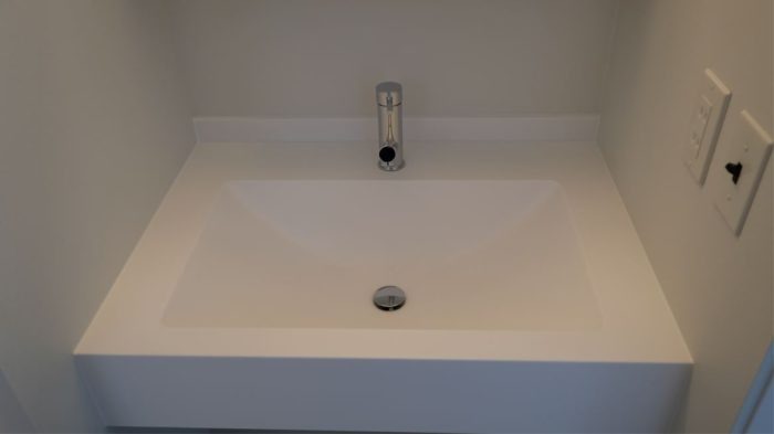 モルタル風のメラミンカウンターもよく使いますが、こちらは人工大理石でできた真っ白のものです。