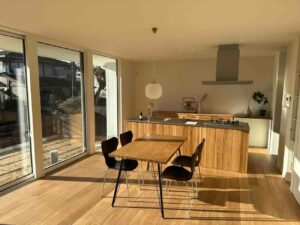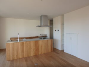 キッチンはオークの面材にバイブレーション仕上げて、空間のポイントになっています!