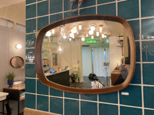 こちらは木フレームのミラー。色や質感がとても素敵で