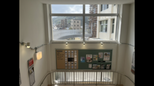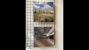 階段の踊り場に掲示板があり、水族館として生まれ変わる前の当初の建物の様子が展示されていました。
