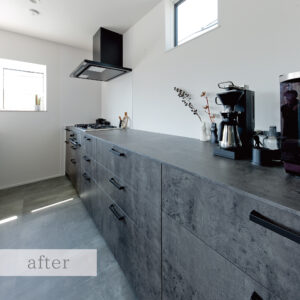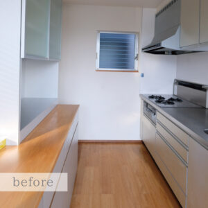 Ⅰ 型のキッチンから Ⅱ 型のキッチンに変わり、壁だった部分には新たに開口部を設けたことで、キッチンへ日差しが入り込み、明るい空間にもなりました!