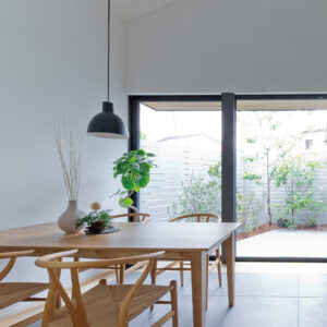 庭の緑を眺めながら縁側で朝ご飯を食べる、休日はウッドデッキに腰をかけて家族でバーベキューをするなど、中庭に出て空間を使うことを目的にしていることが特徴です。