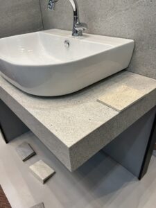 角が糸面になったデザインがかっこよく、海外インテリア風のすごくおしゃれな洗面カウンターで