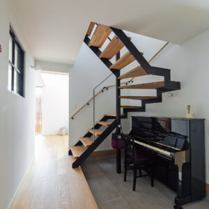 一般的な木階段とは異なり、スタイリッシュでシャープなデザインが特徴的です。