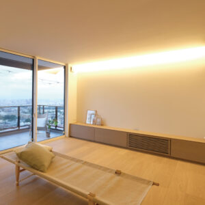 リビングの南側は、隣にお家が建つ計画があるため、あえて窓を設けずに、真っ白な壁にしてしまい、間接照明の光を落としています。