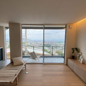 空間を広く見せる工夫として、リビングとバルコニー床はフラットになるよう設計をし、ガラス張りの手すりを設けることで、さらに視界の抜けをつくっています。