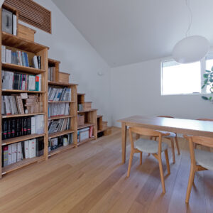 階段の段差に合わせて規則正しく設計された造作棚は、本や雑誌をたっぷり収納するのも良し、余白を活かしてお気に入りの小物を飾るのも良し、と多目的に使えるのが魅力です。