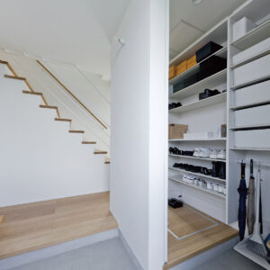 出入口が二箇所に設置されるため、「玄関→シューズクローク→ホール」と動線が一続きになり、自然に移動できるだけでなく、来客時にも便利に対応することができます。