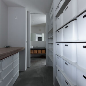 脱衣室を広く取ることで、洗濯の一連の動作「洗う→干す→取り込む→たたむ→しまう」がスムーズに行え、洗濯作業の時間短縮につながります。