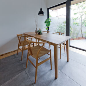 特徴的なY字型の背もたれは、視覚的な軽やかさと同時に快適に支えてくれます。