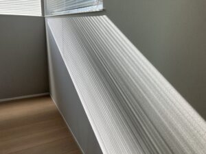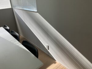 漆喰の壁にブラインドでできた影が映って、なんとも綺麗な陰影ができておりました。