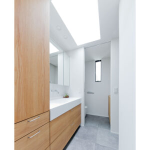 天窓からの光は、季節や天候に応じて表情が変化するため、洗面スペースに心地よい雰囲気を加えます。