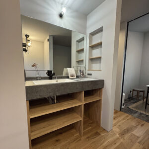 オリジナルの造作洗面スペースには、グレーを基調とした石目模様が特徴のアイカ工業製カウンターと、シームレスで継ぎ目のないボウルを採用しました。