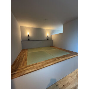 中心部分にはイ草を使用した琉球畳を配置し、縁にはオーク無垢材をふんだんに使うことで、部屋全体に自然な質感を与え、和モダン風の落ち着いた雰囲気を演出しています。