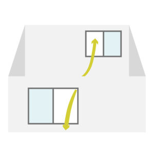 対角線上に位置する二ヵ所の窓を開けると、部屋全体に空気の通り道ができ、効率よく広い範囲を換気することが可能になります。