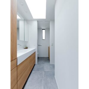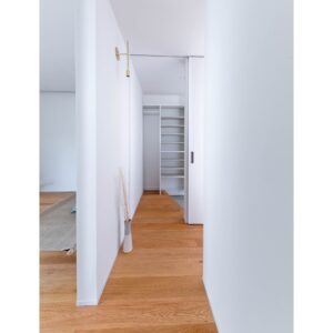 室内のドアを床から天井までのハイドアで仕上げることで、壁面がシームレスに繋がり、部屋全体が広がりを持つように見えます。