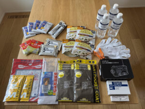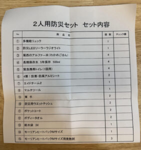 2人用の防災セットですが、水や携帯食に簡易トイレなど