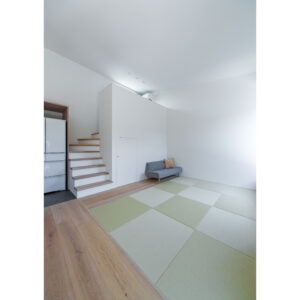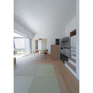 勾配天井を活かした開放感のあるリビングには、畳を採用し、家族がゆったりと過ごすための居心地の良い時間が流れます。