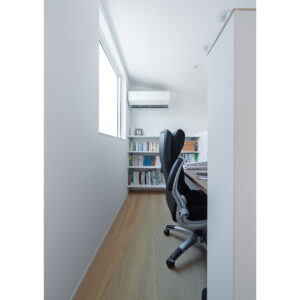 限られた床面積を最大限に活かすため、勾配天井の一番高い部分は、施主様がお仕事できるワークスペースとして空間を活用。