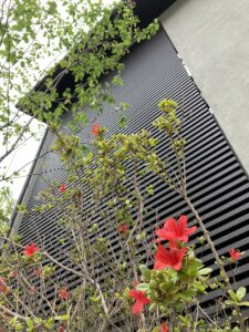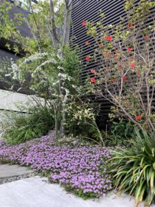いつも普段出社する時は表側から入るのですが、先日ふと目をやると、ちょっと前まで無かった花達がいっせいに咲き誇って鮮やかな色をつけていました