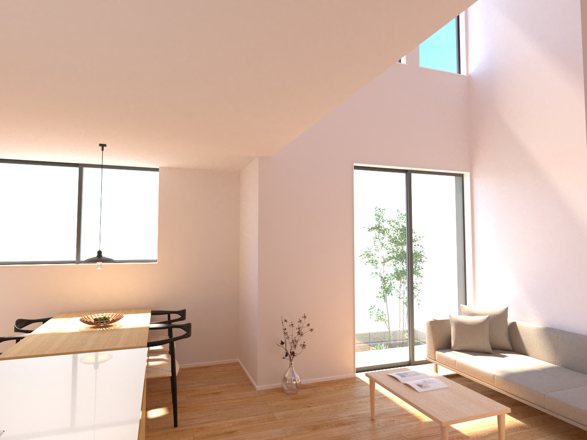 リビングの大きな吹き抜けと、コンパクトで無駄のない回遊動線が特徴で