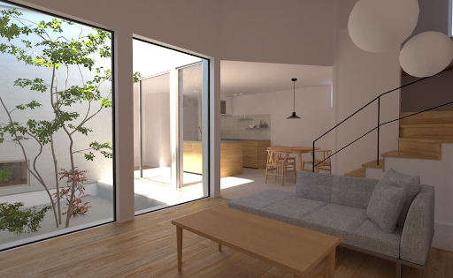 植栽を囲う「ロの字」の中庭をつくりながら、快適な家事動線も取り入れ、LDKとお庭が一体になった家。大きな