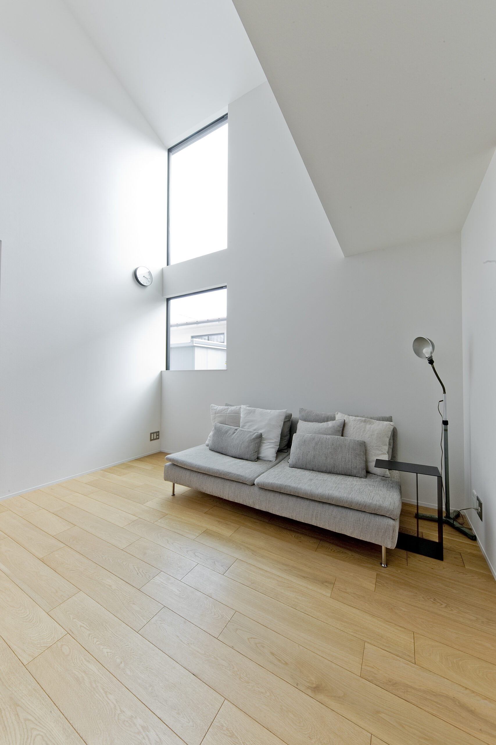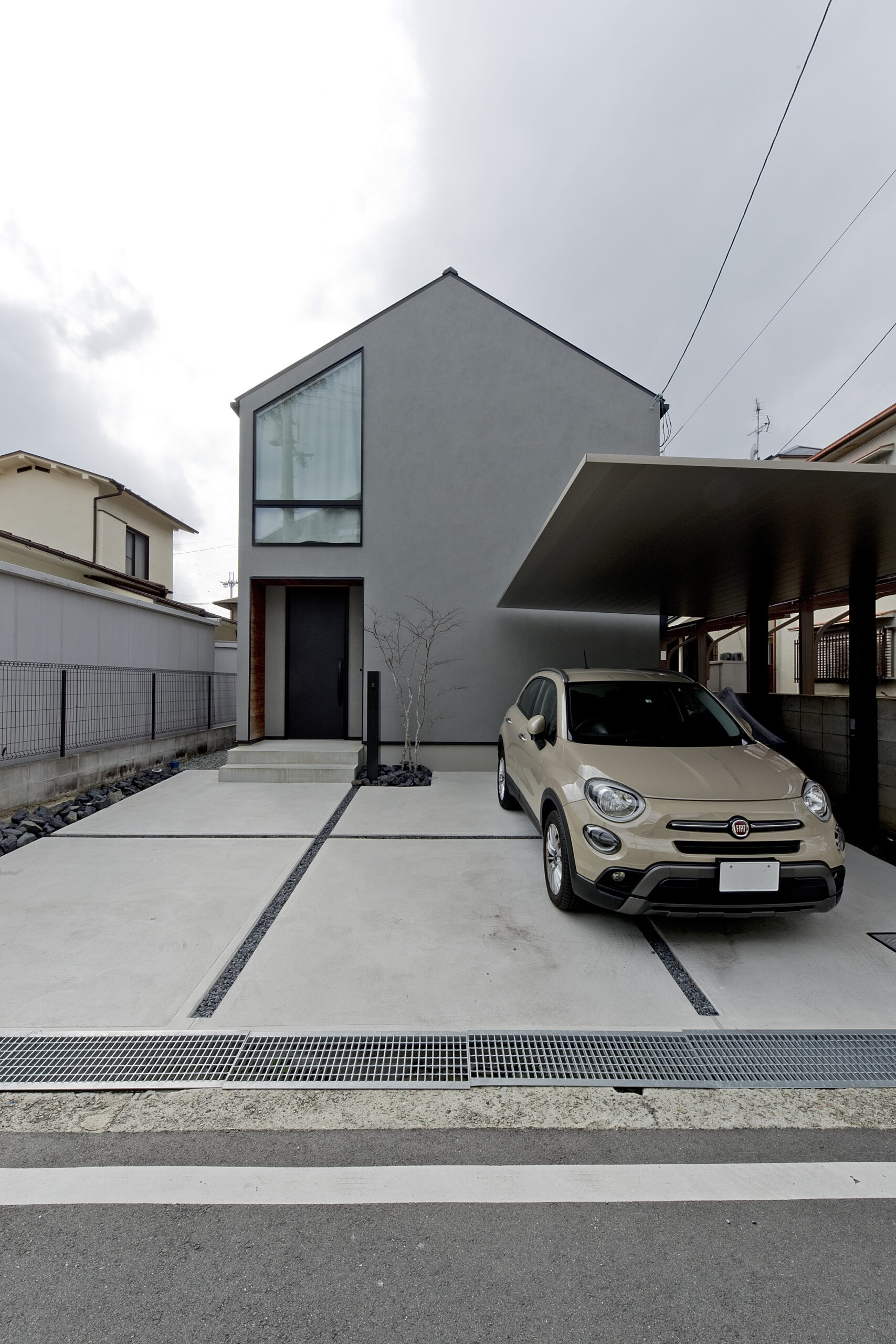 グレーの塗り壁に台形の窓が印象的な稲野の家。
