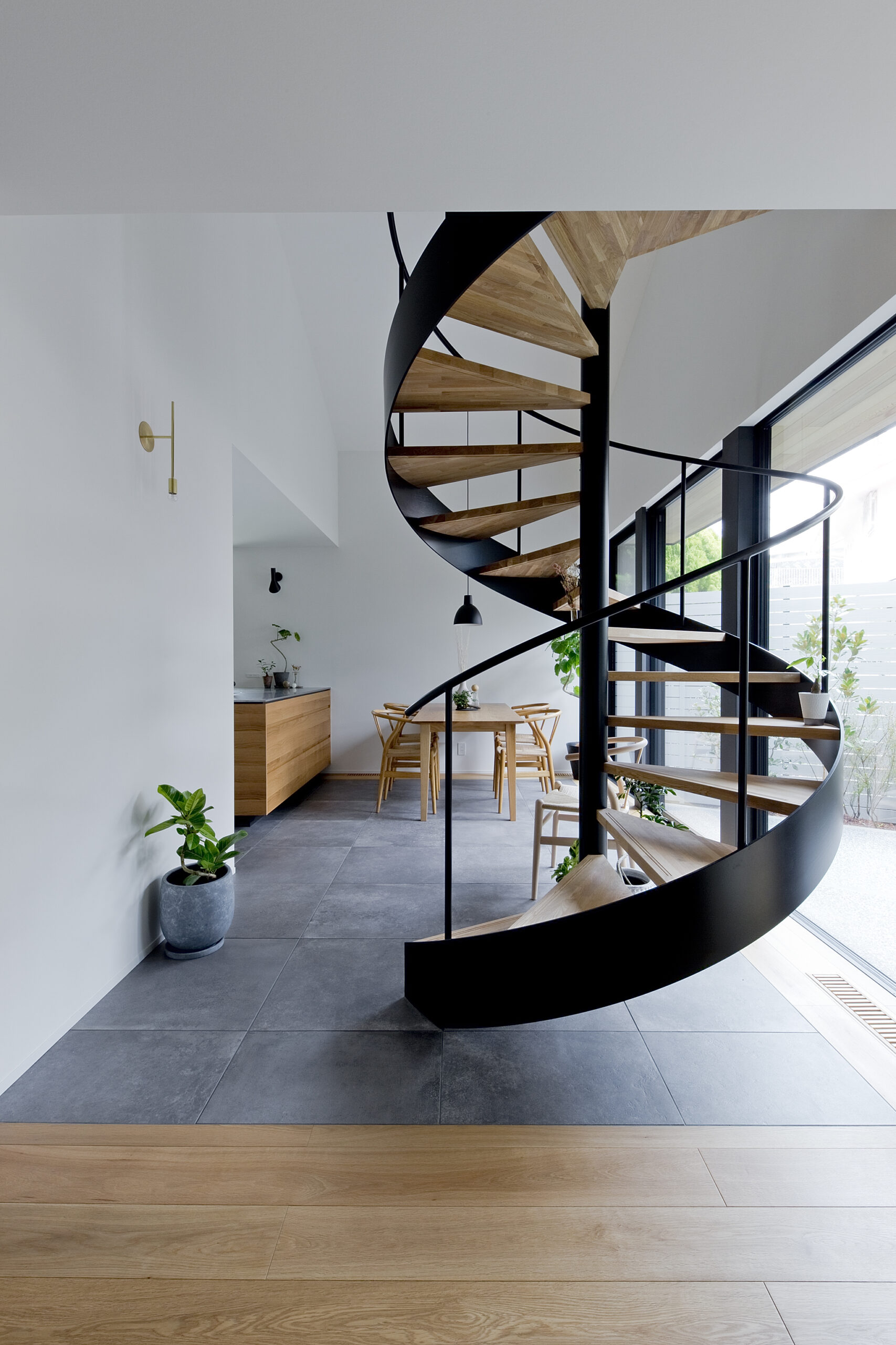 ていねいな暮らしに寄り添う動線計画はそのままに、光と影を美しく表現したデザインやアイアンで仕上げた螺旋階段、