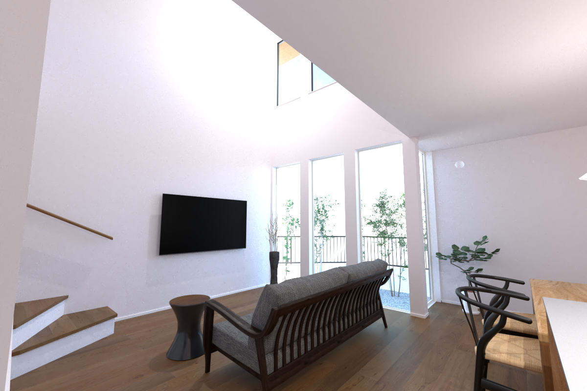 大開口の吹き抜けからは太陽の光がサンサンと降り注ぎ、開放感を感じるリビングに。
