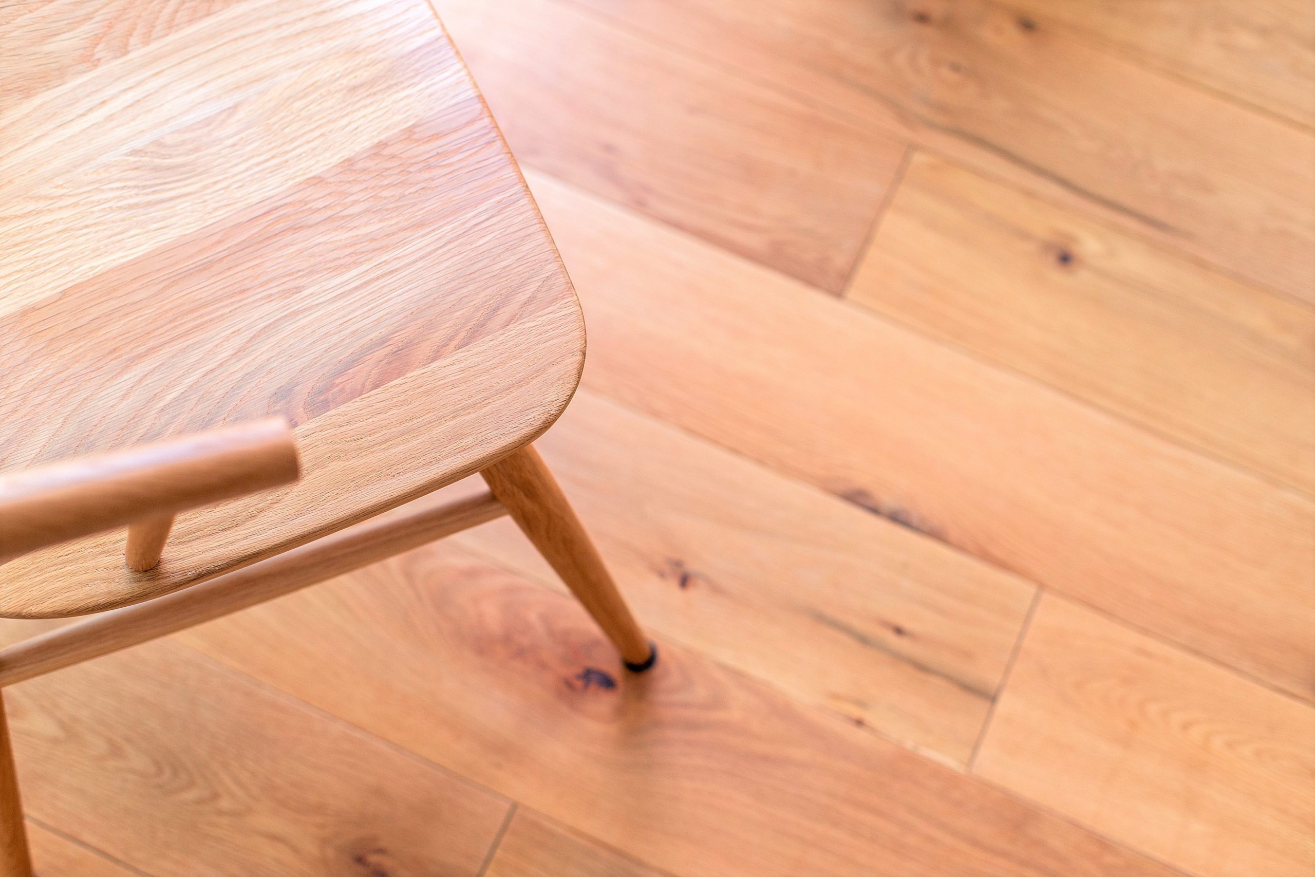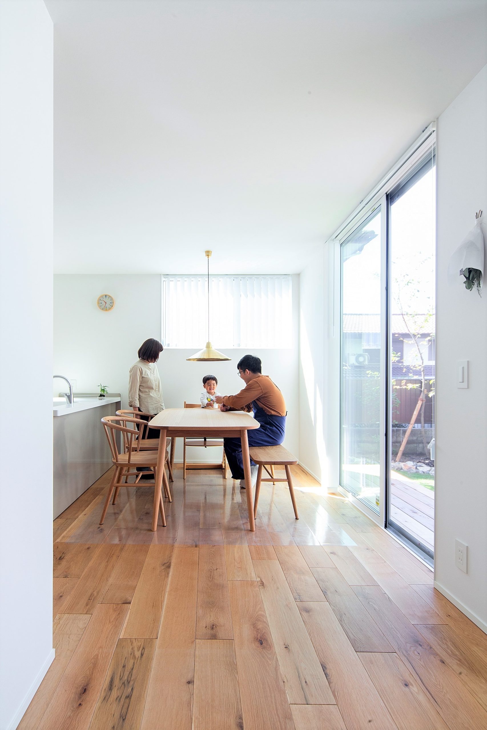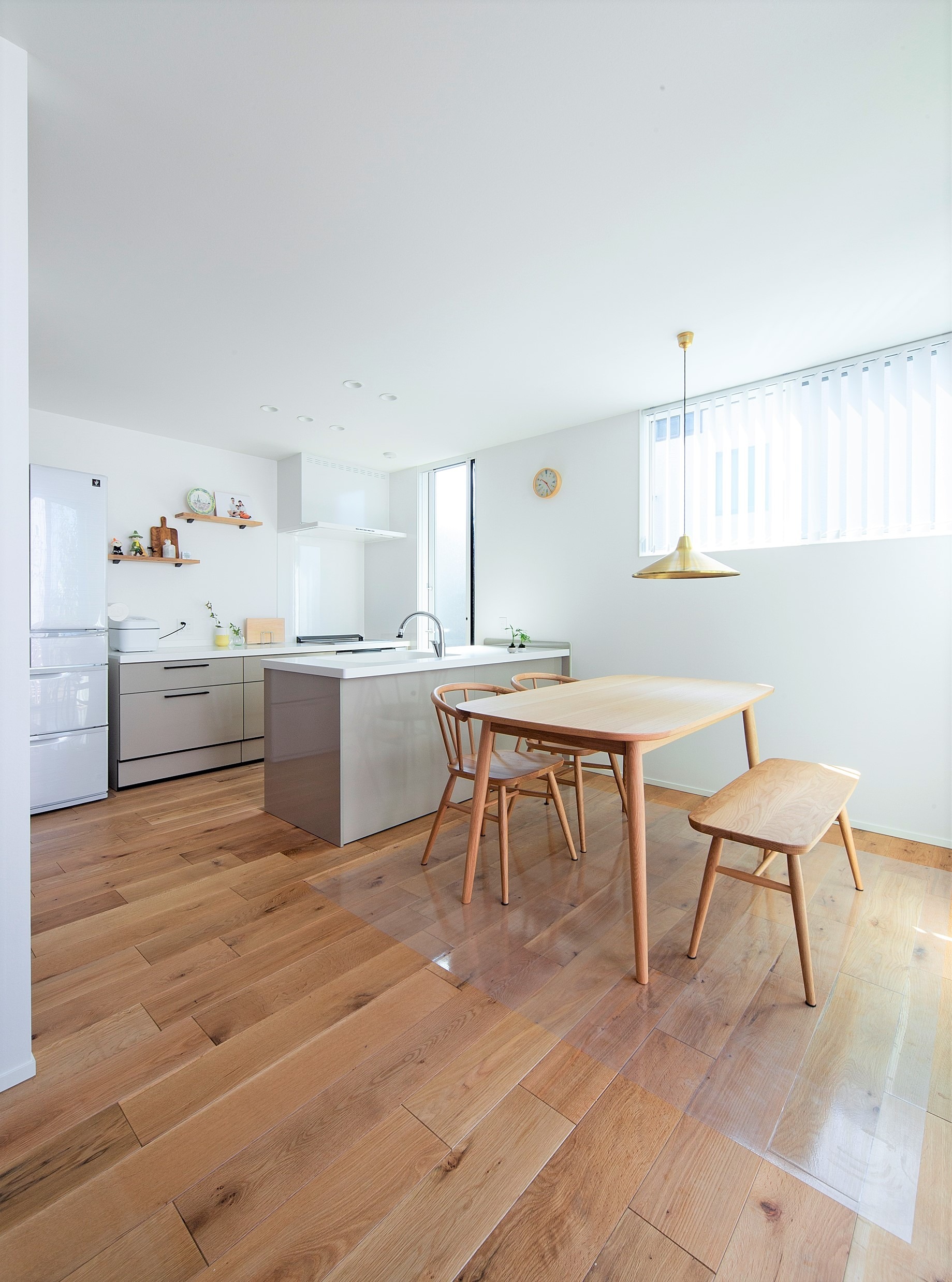天然のオークを使用した床材と漆喰をつかった空間は、