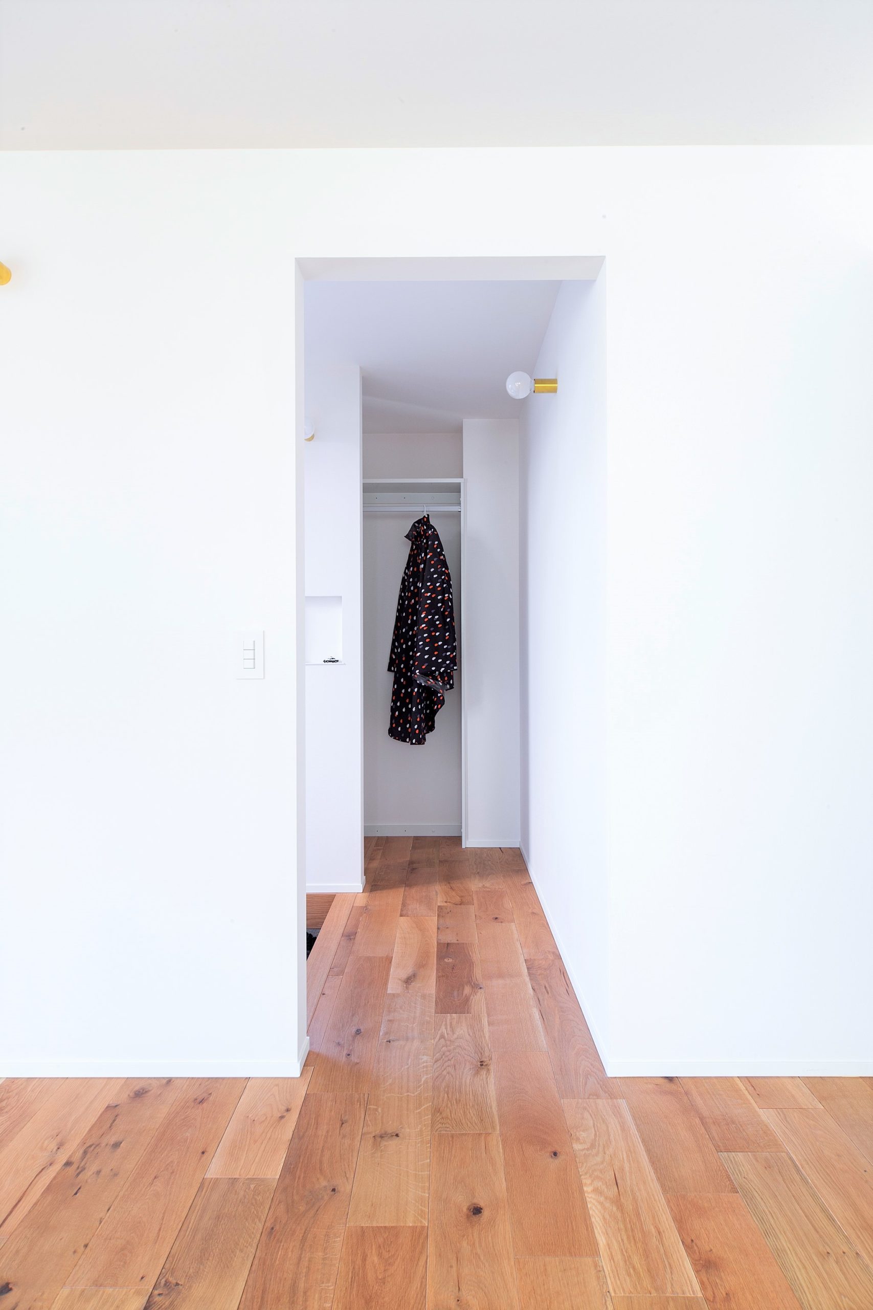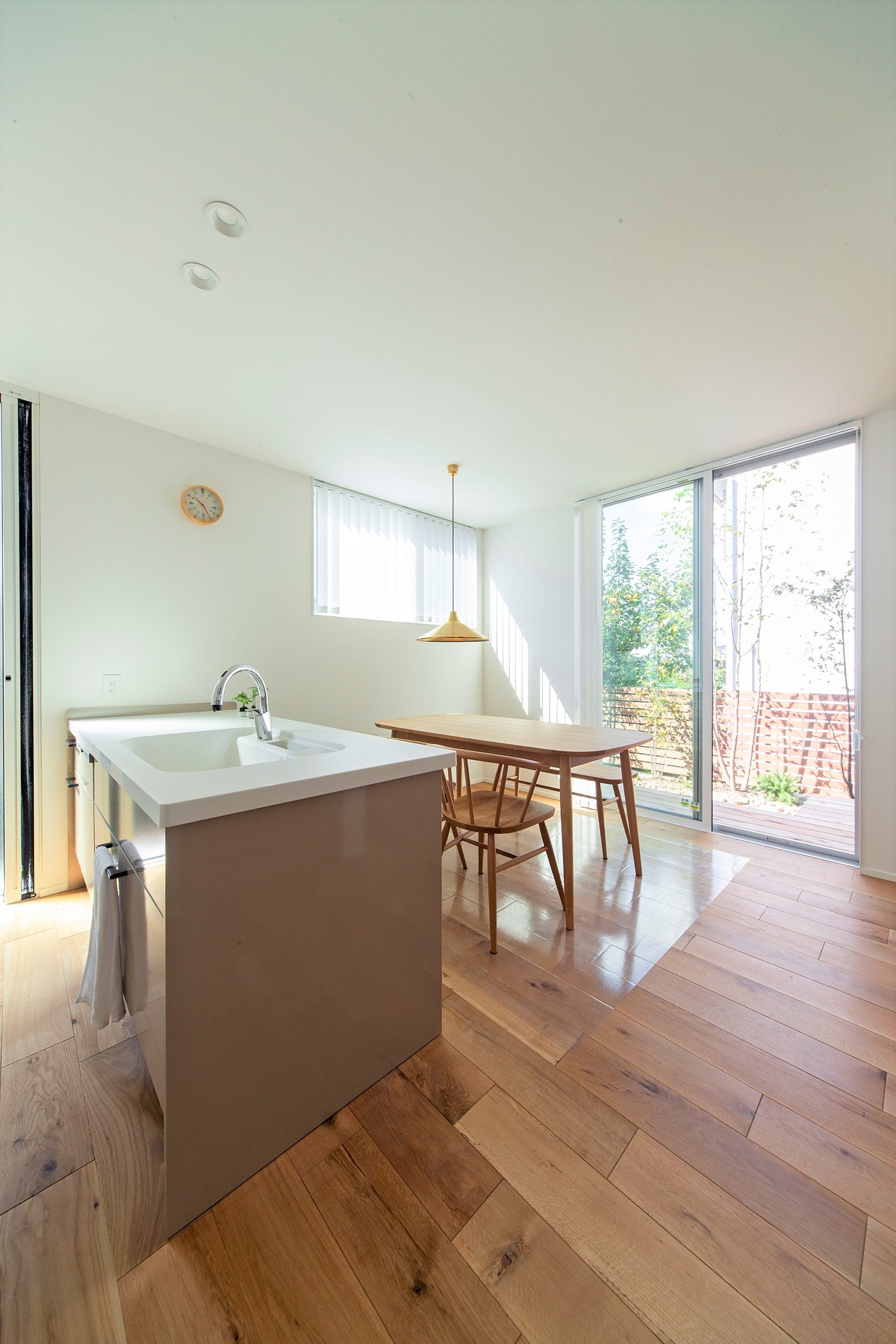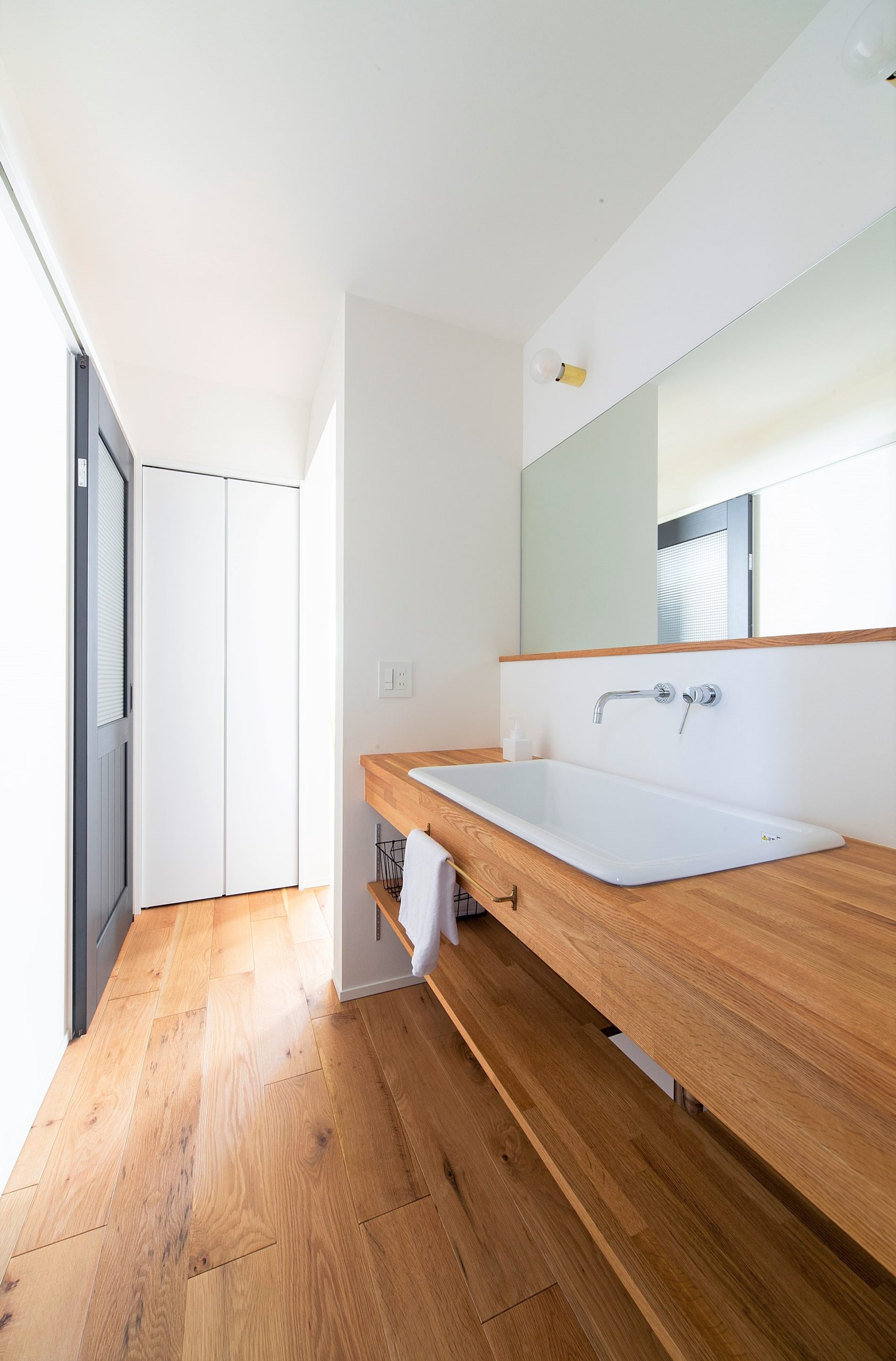 天然のオークを使用した床材と漆喰をつかった空間は、
