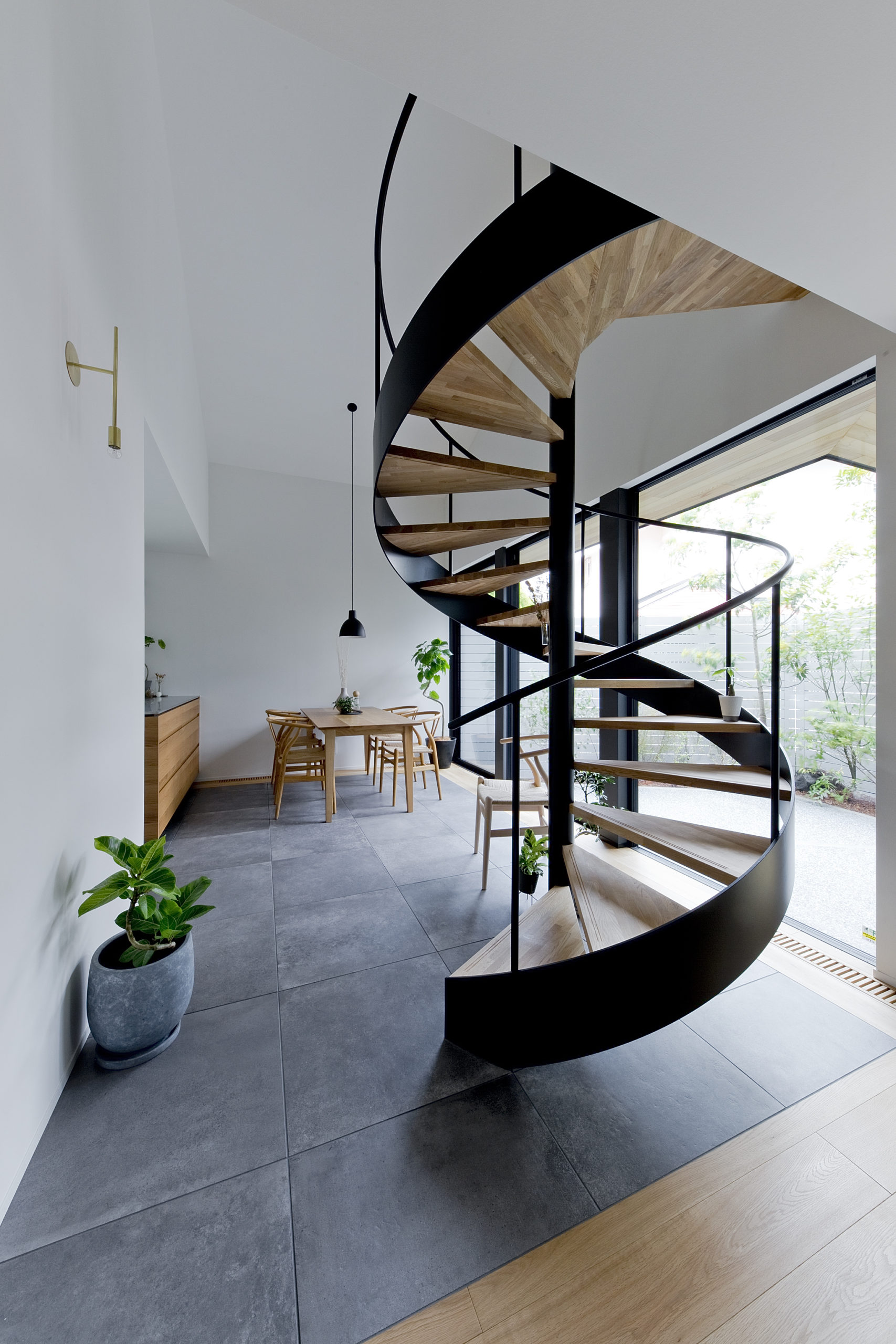 アイアンで仕上げた螺旋階段、タイルの床仕上げなど