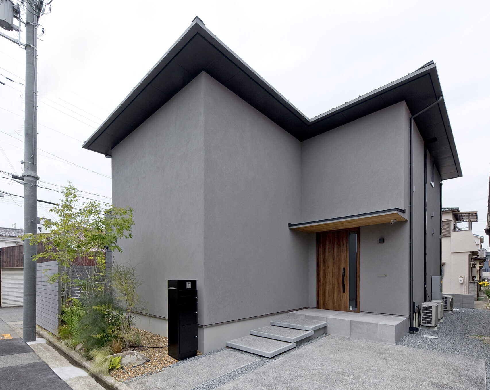 住宅街の角地に佇む、落ち着いたグレーの塗り壁の外観。