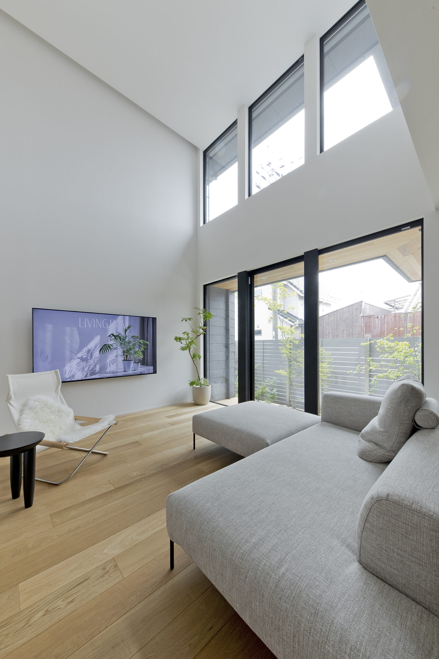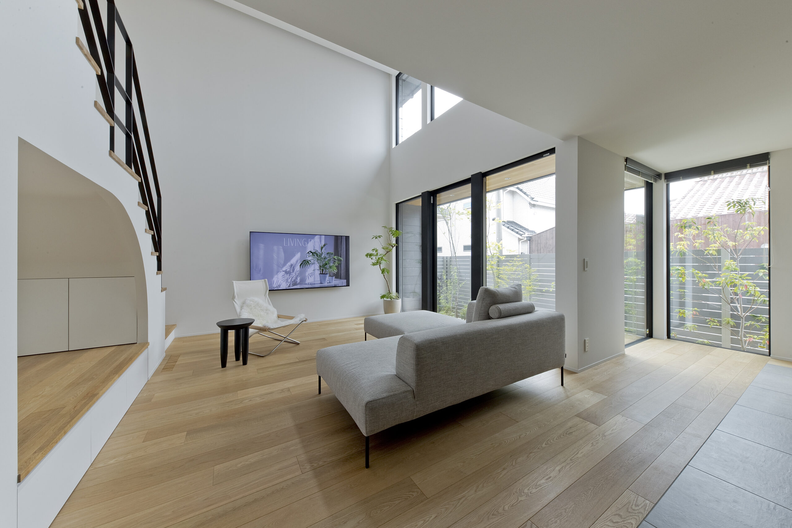 大きな吹抜けと窓が広がり、