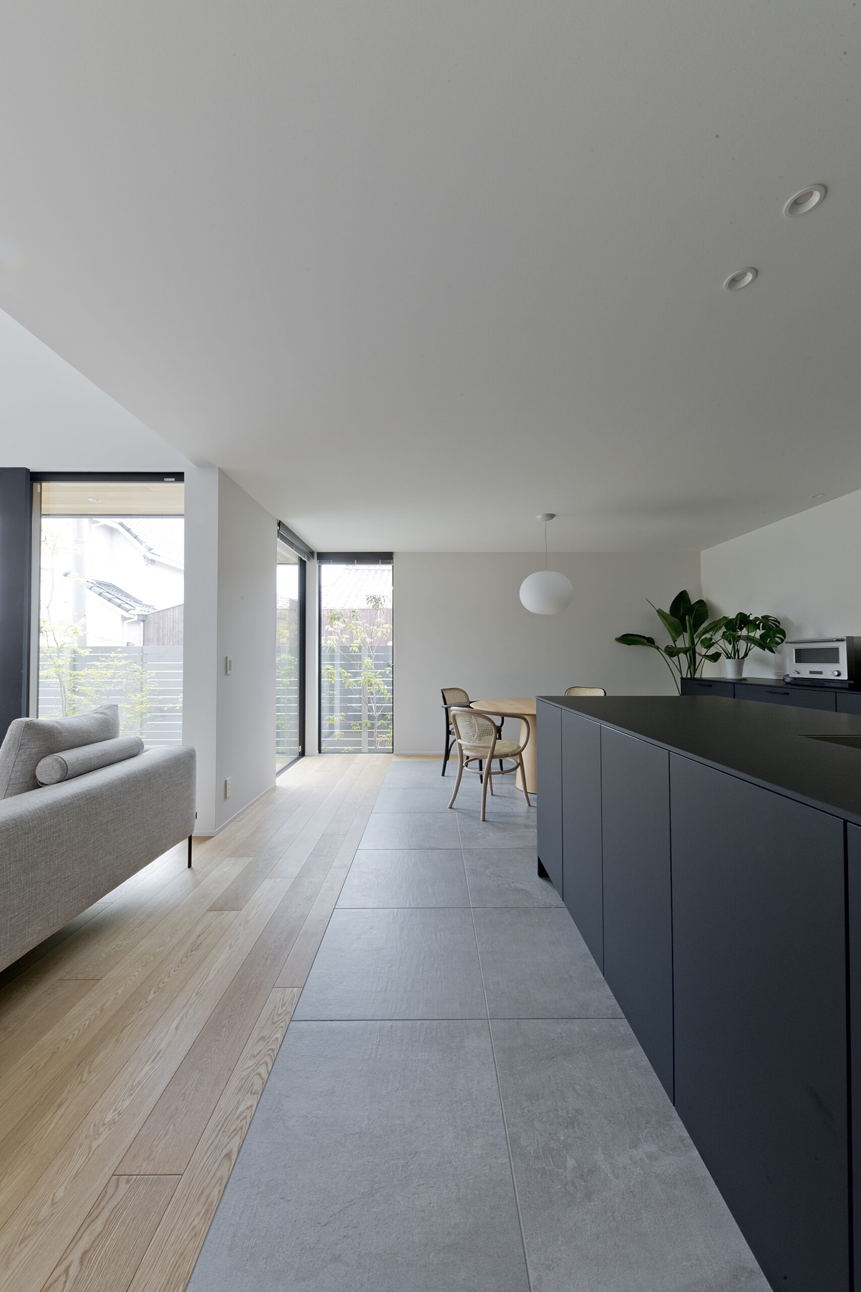 どこにいても庭の緑を感じられるように計画された空間は、
