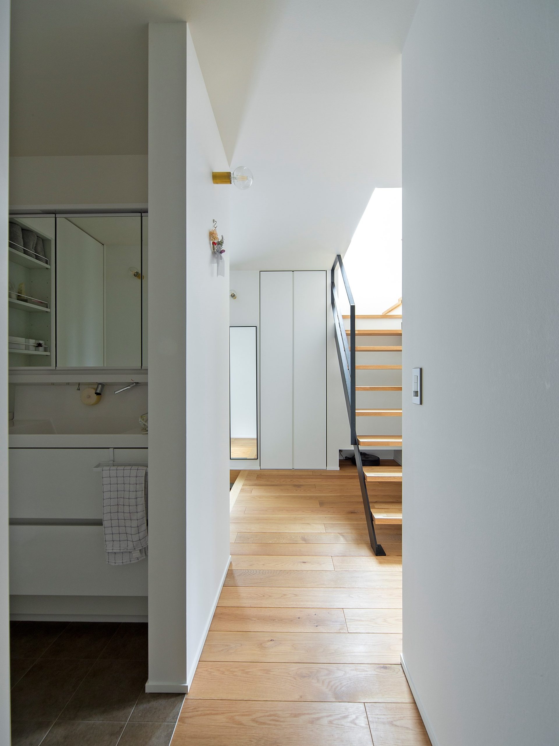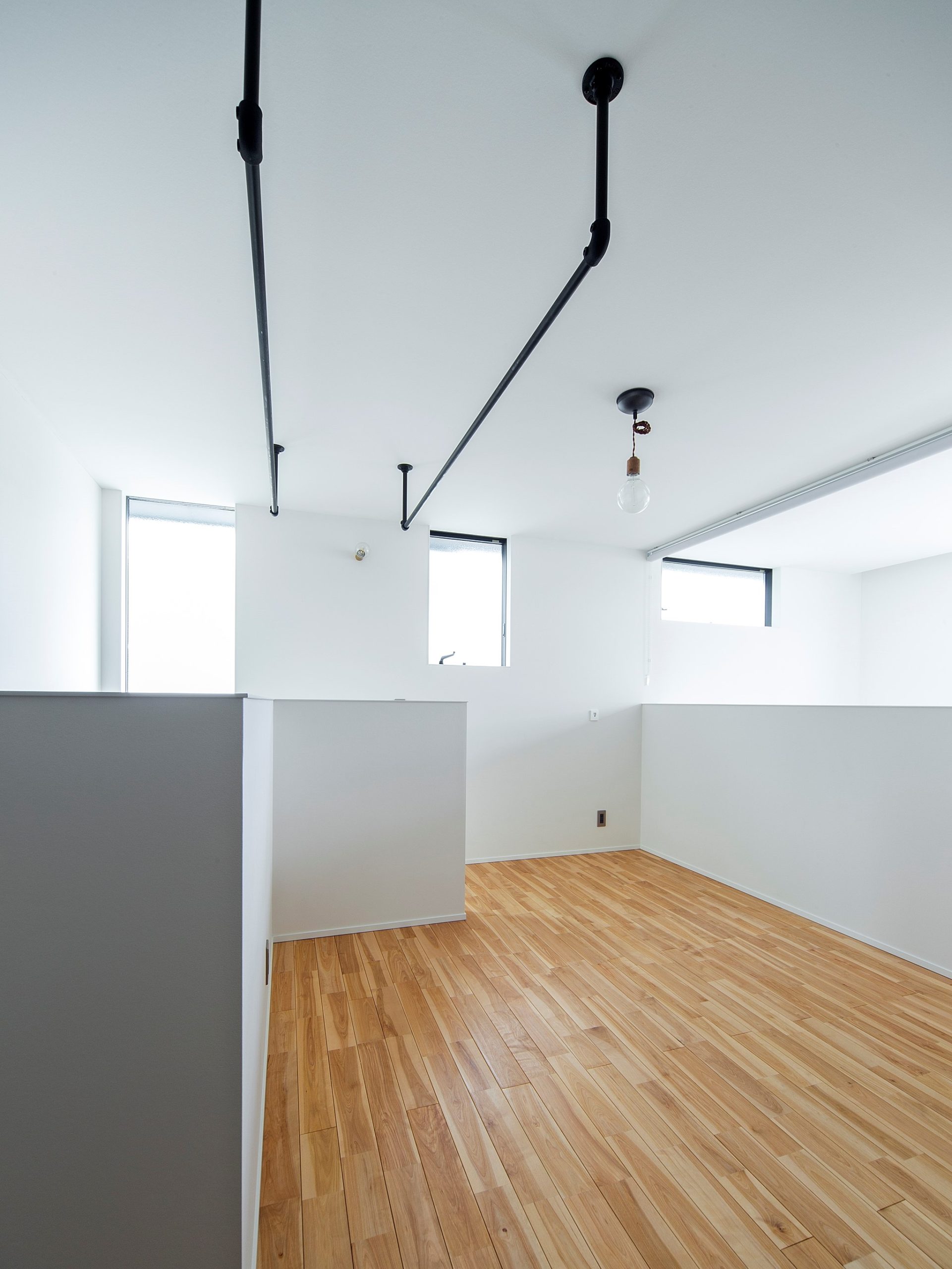 2階の吹き抜けに十字の格子が印象的な