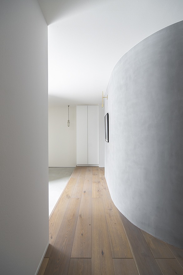 玄関を開けるとモルタル仕上げのアール壁が広がり、まるで美術館のような空間に。