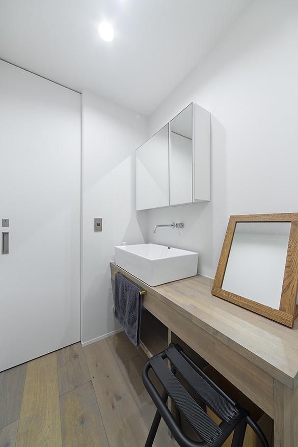 メインの洗面台は壁出し水栓でお掃除の手間も減り、すっきりとしたデザインに。
