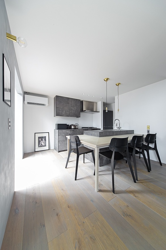 キッチンに取り付けた造作のダイニングテーブル。床色に合わせた塗装で一体感を。